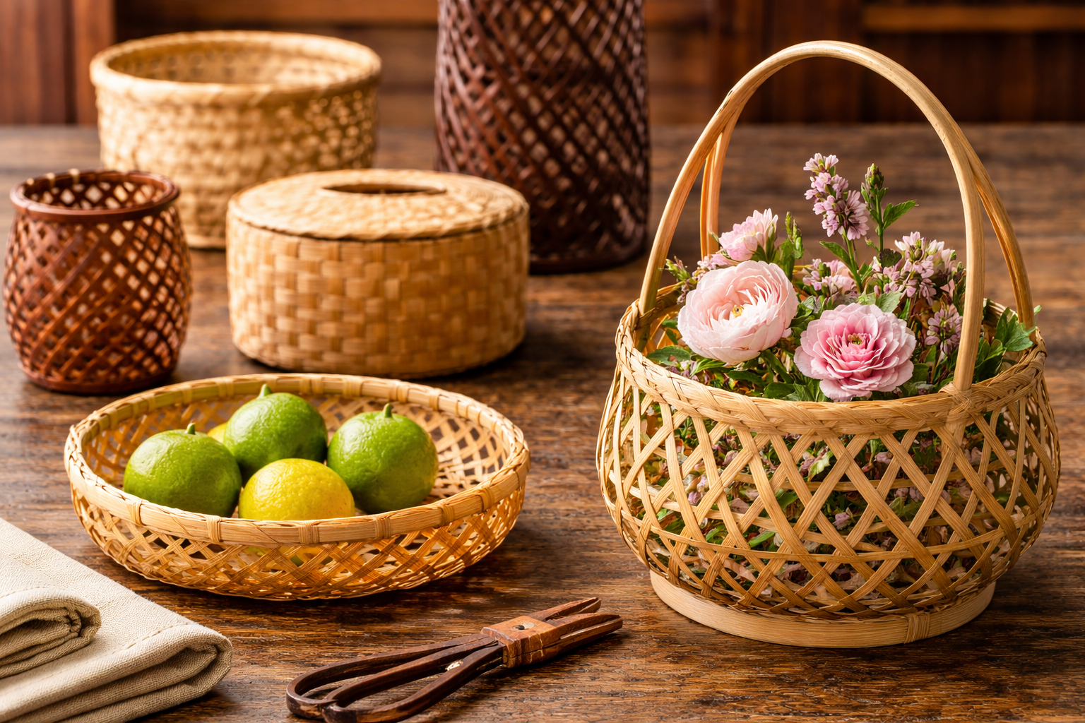“Japanese basketry” usually refers to woven bamboo craft, ranging from practical household baskets to refined ikebana flower baskets and gallery-level art. In Japanese, you’ll commonly see: